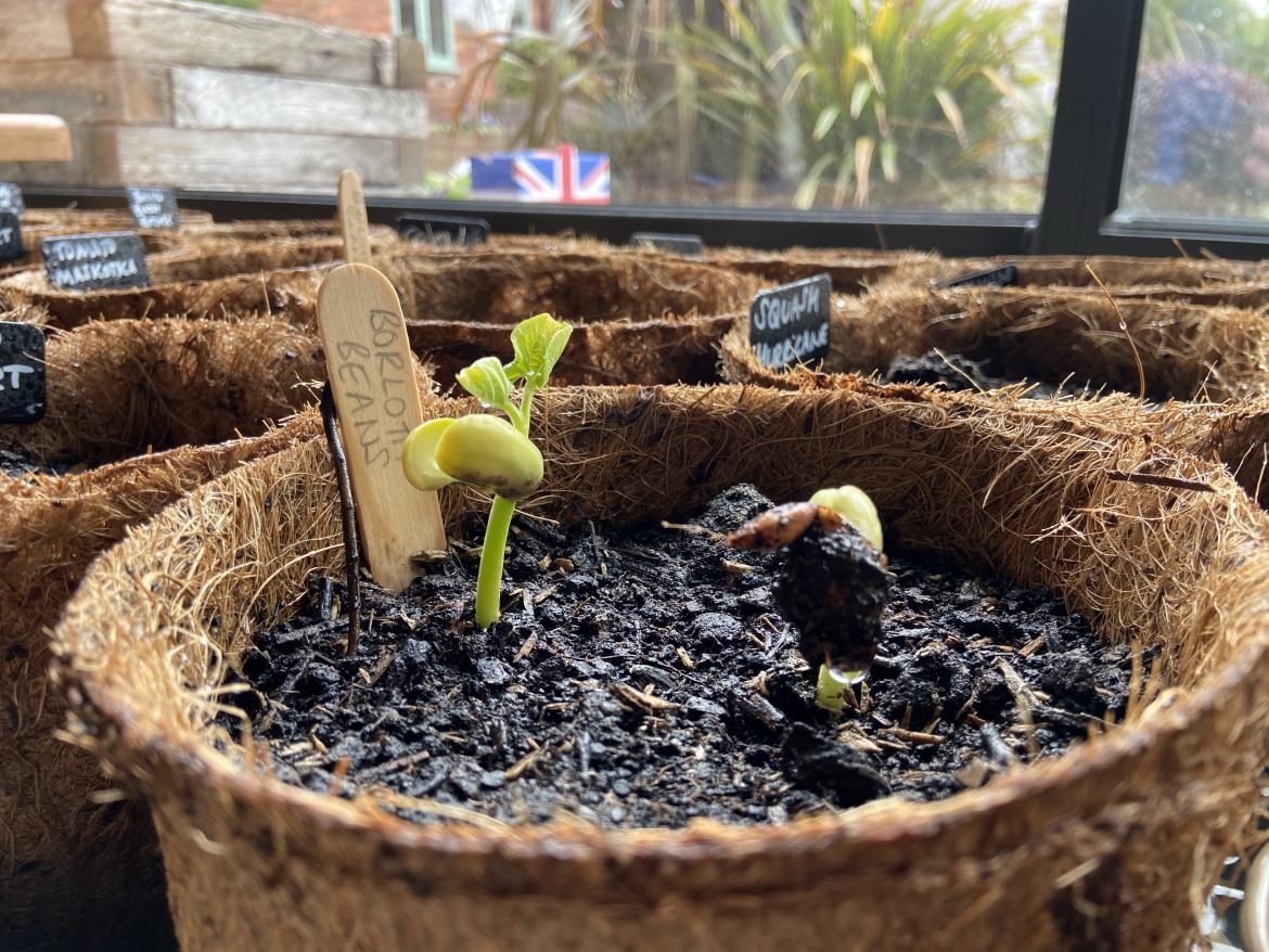 It’s been three weeks since our vegetable seeds went into our assortment of coir and wood pulp fibre pots, and I’m really pleased with how things are coming along. We don’t have a greenhouse, so we use our studio (which has large floor to ceiling windows and sliding doors) that we use to try and simulate a greenhouse scenario.